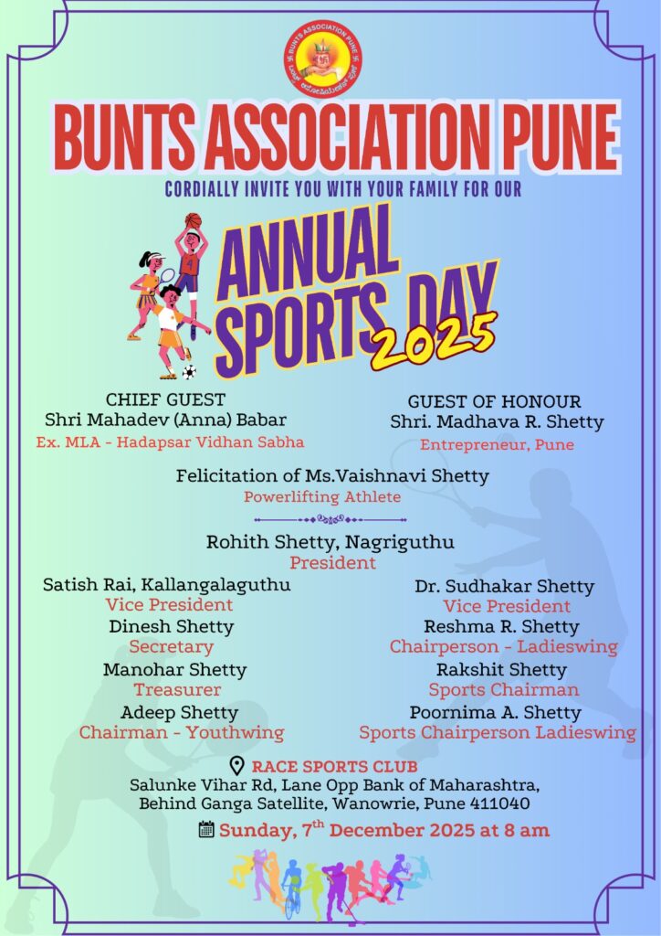 ಈ ಸಂದರ್ಭ ಕ್ರೀಡಾ ಕ್ಷೇತ್ರದಲ್ಲಿ ಸಾಧನೆಗೈದ ರಾಷ್ಟ್ರೀಯ ಮಟ್ಟದ ಪವರ್ ಲಿಫ್ಟಿಂಗ್ನಲ್ಲಿ ಚಿನ್ನದ ಪದಕ ವಿಜೇತ ಪುಣೆಯ ವೈಷ್ಣವಿ ವಸಂತ್ ಶೆಟ್ಟಿ ಅವರನ್ನು ಸಮ್ಮಾನಿಸಲಾಗುವುದು. ಬಂಟ ಸಮಾಜದ ಮಕ್ಕಳು, ಮಹಿಳೆಯರು, ಪುರುಷರು ಸಹಿತ ವಯೋಮಿತಿಗೆ ಅನುಗುಣವಾಗಿ ಕ್ರೀಡಾ ಸ್ಪರ್ಧೆಗಳನ್ನು ಆಯೋಜಿಸಲಾಗಿದೆ. ವಿಶೇಷ ಆಕರ್ಷಣೆಯಾಗಿ ಪುರುಷರು ಮತ್ತು ಮಹಿಳೆಯರಿಗೆ ಹಗ್ಗಜಗ್ಗಾಟ ಸ್ಪರ್ಧೆಯು ನಡೆಯಲಿದೆ. ಕ್ರೀಡಾ ಸ್ಪರ್ಧಿಗಳು ಹಗೂ ಸಮಾಜ ಬಾಂಧವರು ಹೆಚ್ಚಿನ ಸಂಖ್ಯೆಯಲ್ಲಿ ಪಾಲ್ಗೊಂಡು ಕ್ರೀಡೋತ್ಸವದ ಯಶಸ್ಸಿಗೆ ಸಹಕರಿಸುವಂತೆ ಪುಣೆ ಬಂಟ್ಸ್ ಅಸೋಸಿಯೇಶನ್ ಅಧ್ಯಕ್ಷ ರೋಹಿತ್ ಶೆಟ್ಟಿ ನಗ್ರಿಗುತ್ತು, ನಿಕಟಪೂರ್ವ ಅಧ್ಯಕ್ಷ ಗಣೇಶ್ ಹೆಗ್ಡೆ ಪುಣ್ಚೂರು, ಉಪಾಧ್ಯಕ್ಷರಾದ ಡಾ| ಸುಧಾಕರ್ ಶೆಟ್ಟಿ, ಸತೀಶ್ ರೈ ಕಲ್ಲಂಗಳಗುತ್ತು, ಪ್ರಧಾನ ಕಾರ್ಯದರ್ಶಿ ದಿನೇಶ್ ಶೆಟ್ಟಿ ಪೆಲತ್ತೂರು ಮೇಲ್ಮನೆ, ಕೋಶಾಧಿಕಾರಿ ಸಿಎ ಮನೋಹರ್ ಶೆಟ್ಟಿ, ಕ್ರೀಡಾ ಕಾರ್ಯಾಧ್ಯಕ್ಷ ರಕ್ಷಿತ್ ಶೆಟ್ಟಿ, ಮಹಿಳಾ ವಿಭಾಗದ ಕಾರ್ಯಾಧ್ಯಕ್ಷೆ ರೇಷ್ಮಾ ಆರ್. ಶೆಟ್ಟಿ ಮತ್ತು ಯುವವಿಭಾಗದ ಕಾರ್ಯಾಧ್ಯಕ್ಷ ಅದೀಪ್ ಶೆಟ್ಟಿ, ಮಹಿಳಾ ವಿಭಾಗದ ಕ್ರೀಡಾ ಕಾರ್ಯಾಧ್ಯಕ್ಷೆ ಪೂರ್ಣಿಮಾ ಶೆಟ್ಟಿ ಪ್ರಕಟಣೆಯಲ್ಲಿ ತಿಳಿಸಿದ್ದಾರೆ.